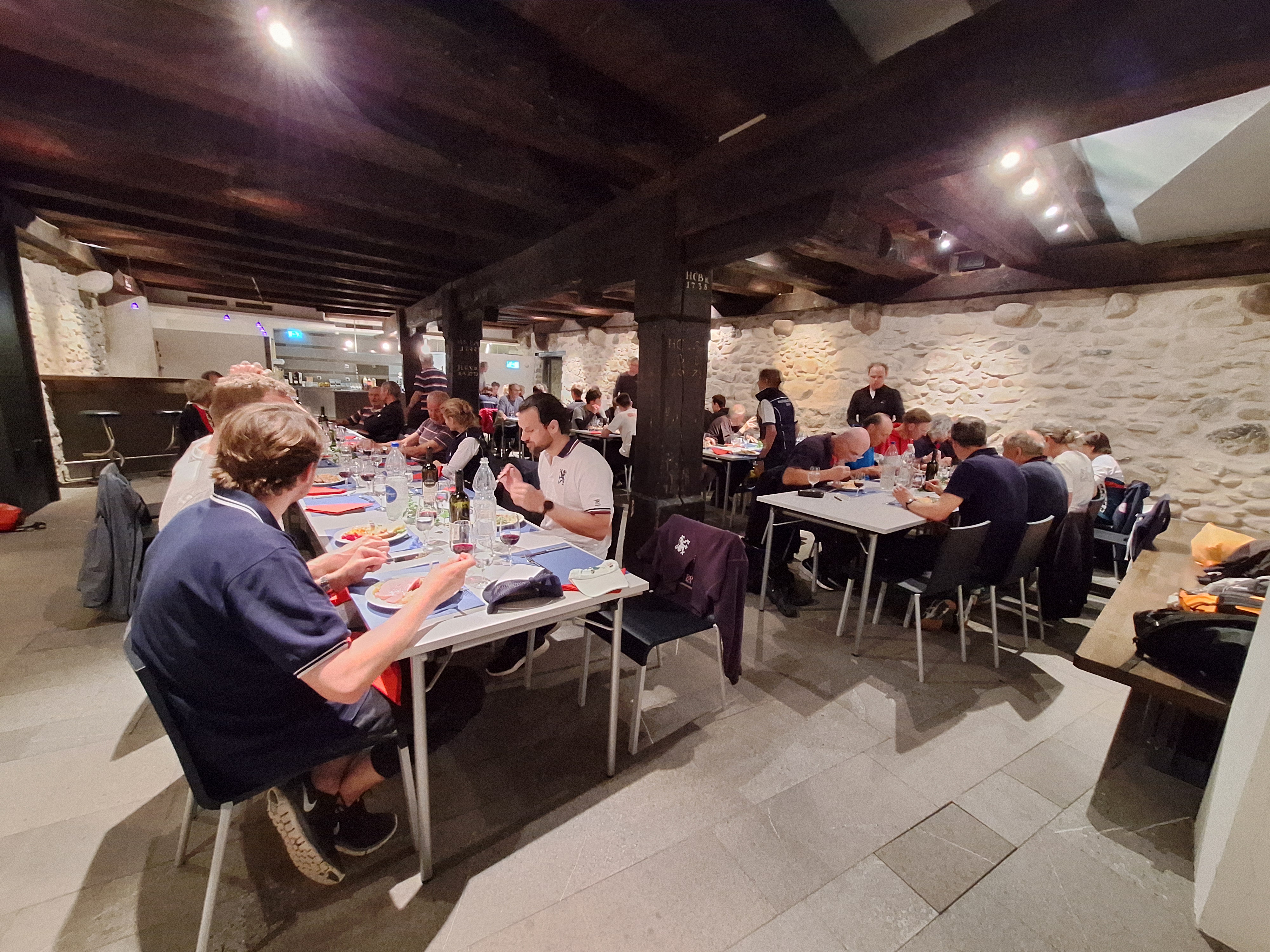 Nach der kurzen Ansprache mit Wein und Wasser, der rund 60 motivierte RuderInnen aus den diversen Clubs lauschten, ging es zum Mittagessen. Der Hunger war bereits bemerkbar, und so waren wir alle froh, als uns der kurze Fussmarsch ins Restaurant Bürgerasyl brachte und wir mit einer köstlichen Bouillon empfangen wurden. Die Plätze wurden eingenommen, Geschichten, Erfahrungen wurden ausgetauscht, das köstliche Essen vom Buffet liess sich jeder schmecken und man merkte die Entspannung, die sich breit machte. Ob es am Essen, am Wein, am gemeinsamen Geniessen lag, wer weiss.